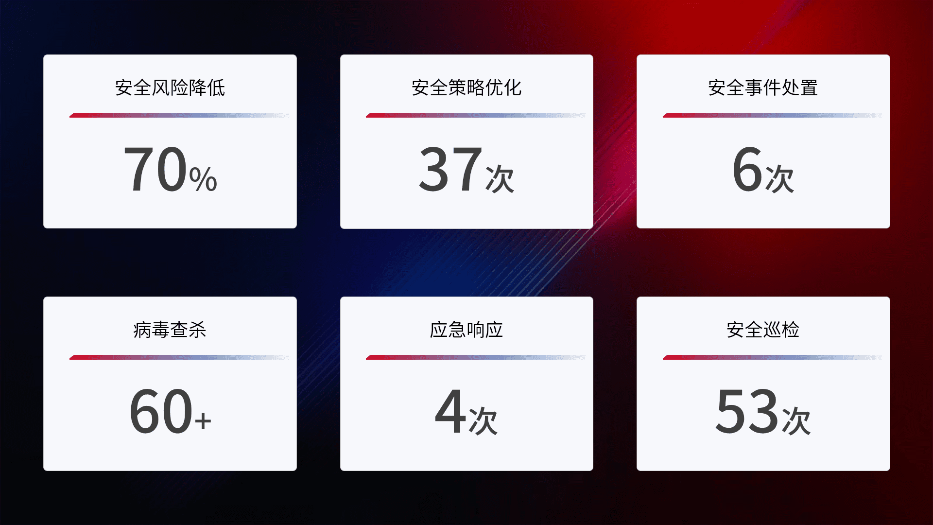 提供全面的安全事件报告体系,,,包括处置报告、、周报、、、、季度和年度总结,,,结合持续监控,,,帮助客户深入了解网络安全状况。。。