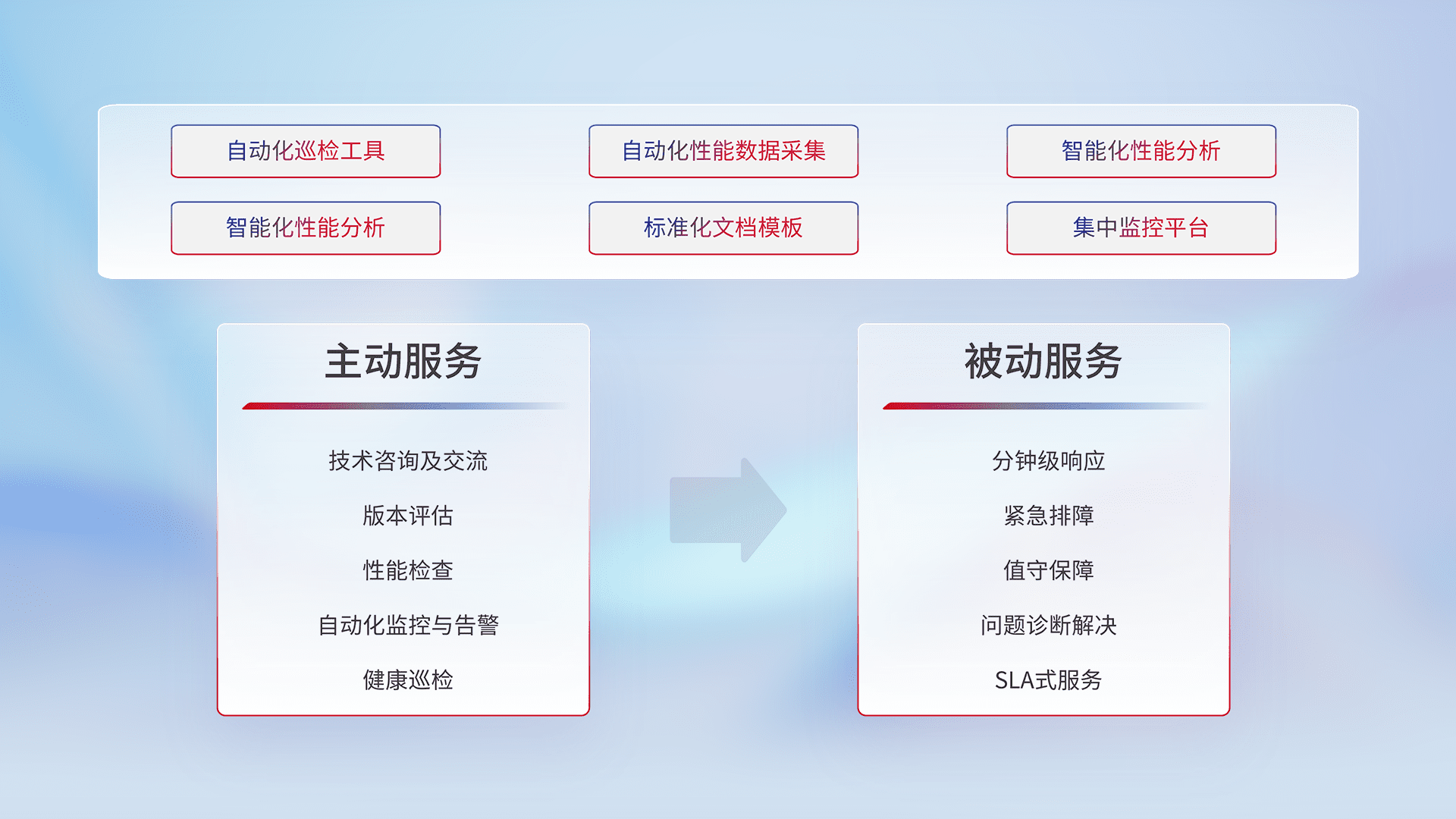 智能化工具和标准化文档,,保障服务质量,,,,提供主动服务(包含技术咨询、、、、版本评估、、性能检查、、自动化监控与告警、、、、健康巡检)和被动服务包含(分钟级响应、、、、紧急排障、、、、值守保障、、问题诊断解决、、SLA服务)。。。